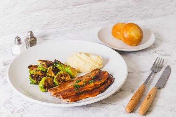 Thinly sliced smoked beef brisket, rosemary au jus, fresh herbs, mashed potato, and roasted brussels sprouts