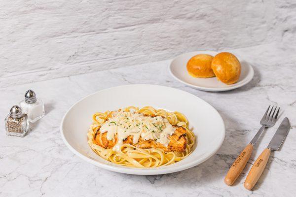 Grilled chicken, fettuccini pasta, and a creamy garlic parmesan sauce