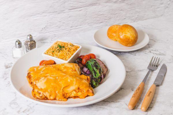 Flour tortillas stuffed with seasoned chicken, Monterey Jack cheese, and fresh herbs. Topped with Mexican cheese, cheddar cheese, and enchilada sauce. Served with Mexican rice and grilled vegetables