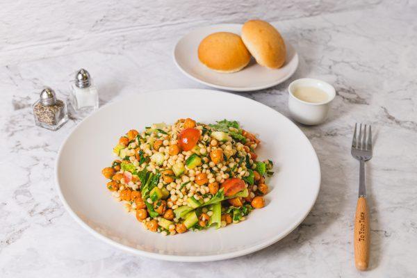 Romaine lettuce, couscous, chickpeas, cucumber, tomato, and lemon vinaigrette