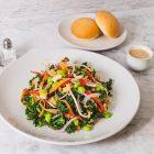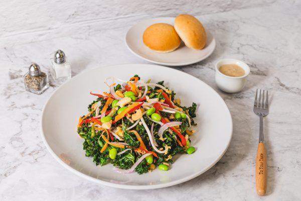 Kale, edamame, carrot, bean sprouts, bell pepper, purple onion, cashews, and sesame-garlic dressing