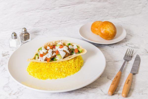 Middle Eastern chickpea fritters, naan bread, cucumber, tomato, onion, tzatziki sauce, and saffron rice