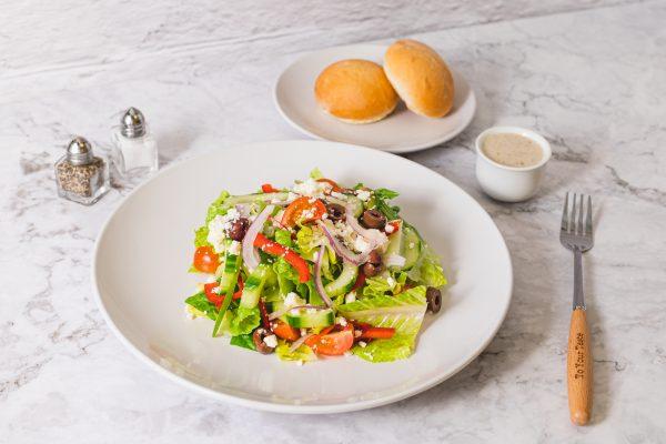 Romaine lettuce, red onion, bell pepper, tomato, cucumber, crumbled feta cheese, Greek olives, and oregano vinaigrette
