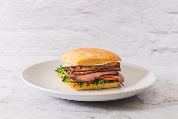 Sliced roast beef, provolone cheese, caramelized onions and mayonnaise, on a ciabatta bun. Includes chips