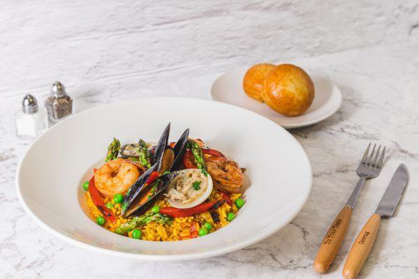 Shrimp, clams, mussels, vegetables, and saffron rice