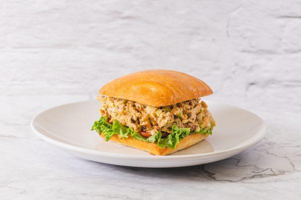 Textured vegetable protein, celery, onion, and vegan mayonnaise on a ciabatta roll. Includes chips